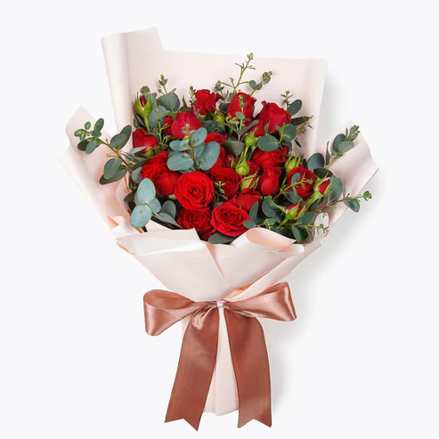 A petite arrangement of ravishing spray red roses, decorated with sprays of eucalyptus gunny. Our Lovesong mini bouquet is the perfect little gesture to make your darling blush like never before.